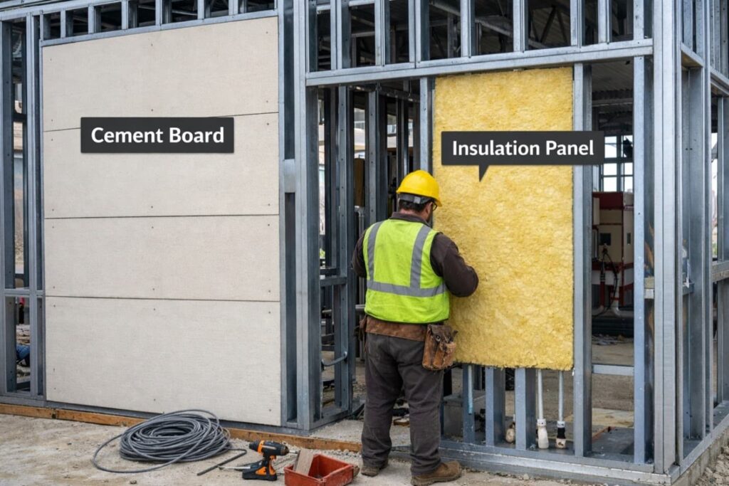 استفاده از پنل سیمانی/فایبرسمنت به عنوان لایه پوششی (sheathing/cladding) و به‌کارگیری عایق‌هایی مانند پلی‌استایرن و پشم سنگ در سیستم‌های فولاد نورد سرد از نظر تخصصی در واقع بهترین روش است.